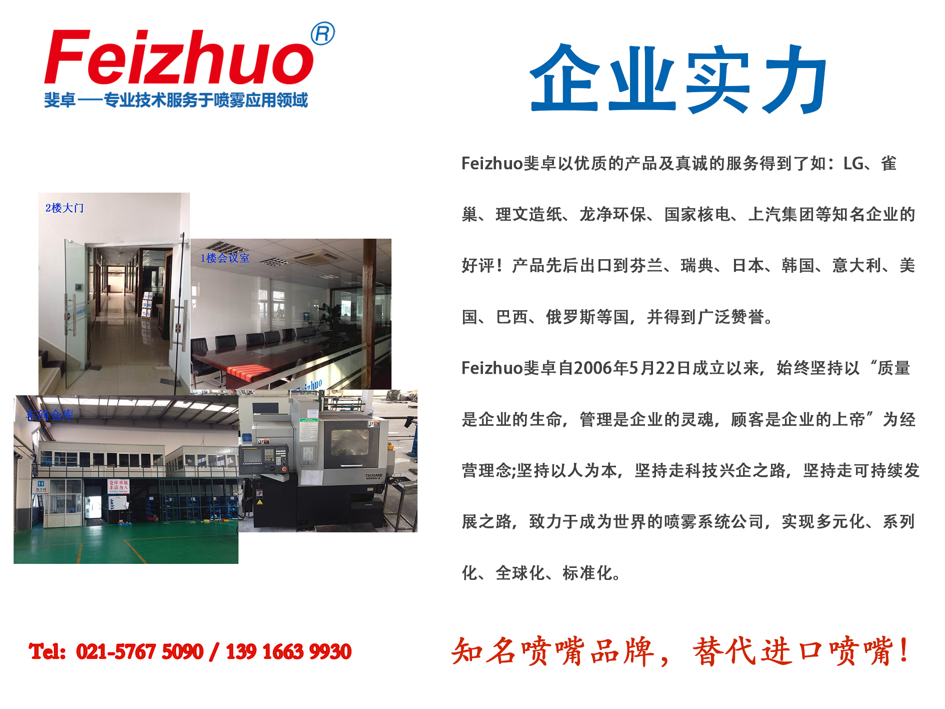 噴嘴價(jià)格實(shí)惠,噴嘴質(zhì)量好,是Feizhuo斐卓噴嘴在行業(yè)內(nèi)占據(jù)重要地位和市場(chǎng)的標(biāo)志,我們?cè)趪鴥?nèi)各大紙廠,完全替代進(jìn)口噴嘴、水針、噴淋擺動(dòng)裝置!在環(huán)保行業(yè),將高昂的進(jìn)口脫硝噴槍用國產(chǎn)化替代,達(dá)到脫硝噴槍霧化效果好,使用壽命長(zhǎng),脫硝效率高的特點(diǎn)!占據(jù)汽車制造廠的噴嘴使用份額近一半,噴嘴產(chǎn)品還廣泛應(yīng)用于食品飲料、電子、化工、清洗、生物制藥、航天航空等領(lǐng)域!